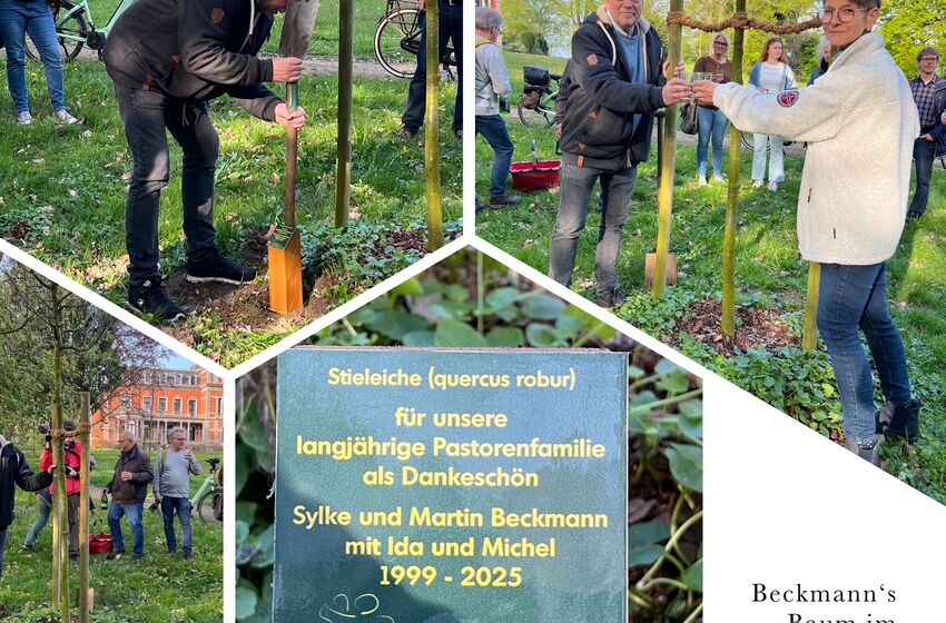 Der Baum im Schlosspark wurde schon im letzten Jahr gepflanzt und ist schön angewachsen. Jetzt wurde die Stele eingesetzt. Ein Geschenk vom Kirchenvorstand an Pastor Beckmann und Famillie.