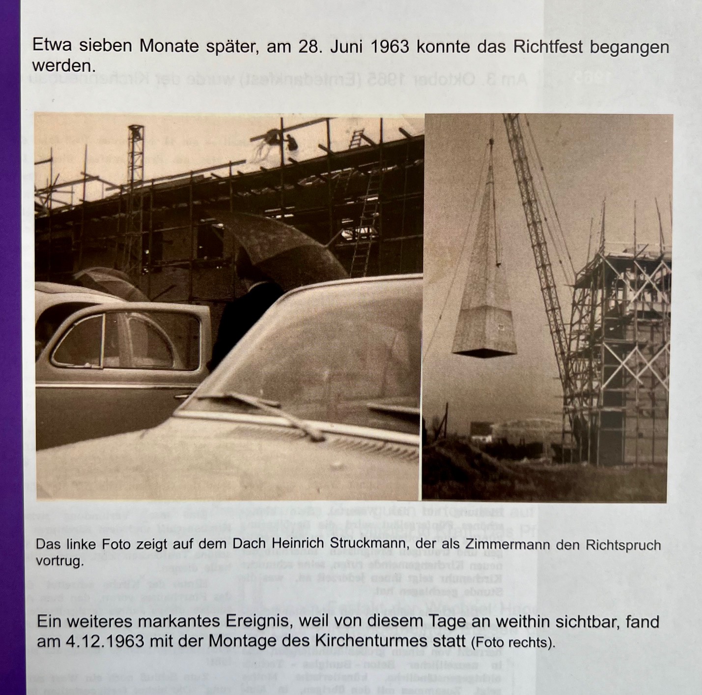 Etwa sieben Monate später, am 28. Juni 1963 konnte das Richtfest gefeiert werden. Ein weiteres markantes Ereignis, weil von diesem Tage an weithin sichtbar, fand am 04.12.1963 mit der Montage des Kirchturmes statt.